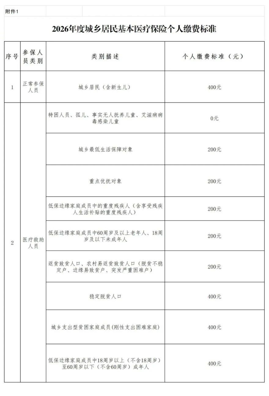 1.2026年度城乡居民基本医疗保险个人缴费标准