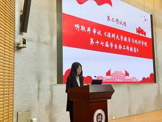 数学与统计学院第十七届学生会委员会工作报告》。陈梦琪总结在这一年中,学生会委员会积极响应学校领导的号召,认真履行自己的职责,开展了多项有意义的活动,解决了许多问题,包括但不限于评选先进班集体、筹备并开展了宿舍美化大赛等。学生会委员会认真总结了前几届的工作经验,不断改进工作方式方法,加强了对学生权益工作的重视和关注。陈梦琪还指出,学生会委员会在过去的一年里做的不好的及需要改进的方面,还需要继续深化和改进,真正做到“在你身边,为你代言”。