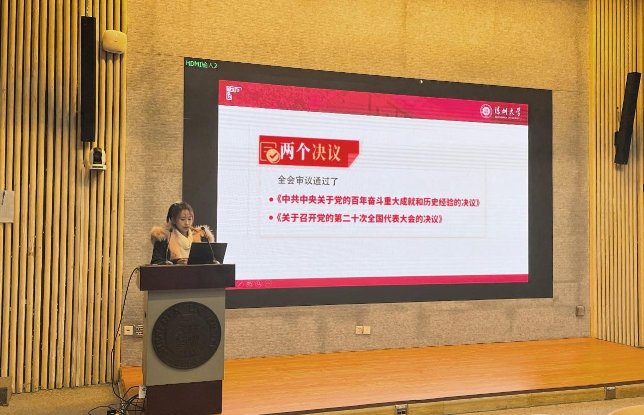 党的十九届六中全会全面总结中国共产党百年奋斗的重大成就和历史经验,对统一全党的思想、坚定信心开创未来,对我们认识历史规律、增强历史自觉、掌握历史主动,对推动全党牢记初心使命、团结带领全国各族人民夺取新时代中国特色社会主义的伟大胜利,具有十分重大的意义,本期团课学习主要围绕解读党的十九届六中全会精神展开。肖老师通过数字带领全体学生一起解读会议精神——包括“两个决议”、“马克思主义中国化的三次飞跃”、“四个伟大成就”、“党的百年奋斗的五大历史意义”、“十大经验”和“十八大以来十三方面的成就”。