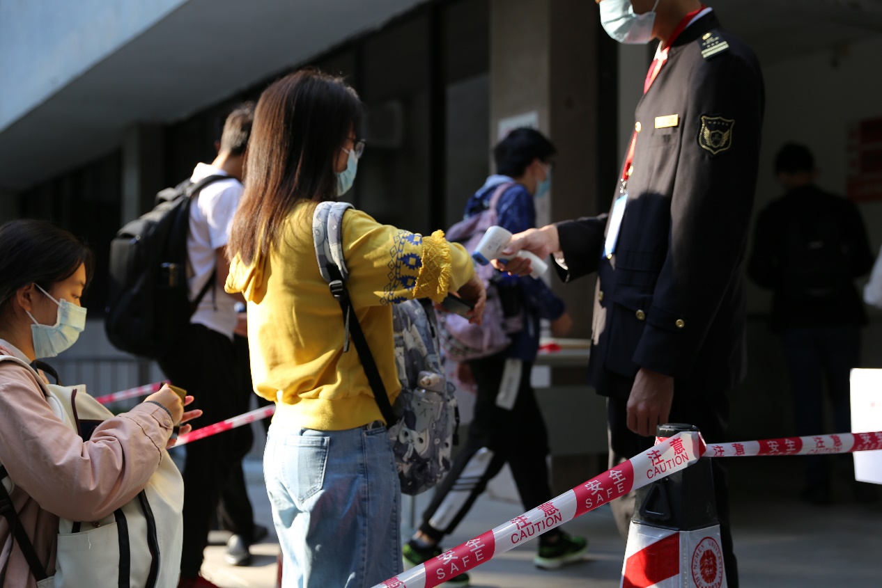 时间来到8点15分,在安保人员与志愿者的规划调节及安排下,考生们开始井然有序地进入考场。为做好防疫工作,在场的工作人员和考生都要求佩戴口罩。同时,考生在入场时需要进行体温检测,志愿者们更是提前准备了口罩及消毒洗手液,以确保考场的防疫措施安全到位。