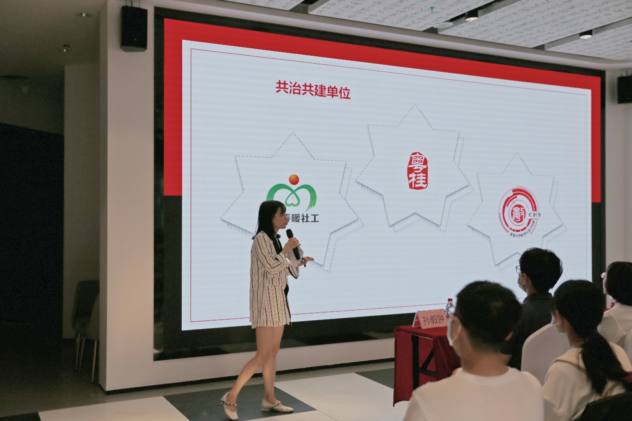 随后,主持人介绍粤桂社区长者探访队的建立背景、基本情况以及建立目标。探访队的建立背景:粤桂与深大、滨海片区协间发展,形成联动,实现校区、社区、园区资源共享。粤桂社区长者探访队就是校区与社区资源共享联动很好的实例,粤桂社区有高龄长者,深大数院有优质的志愿者资源,推动邻里友善、关爱社区长者,营造良好的敬老爱老社区氛围。探访队共治共建单位由数学与统计学院、粤桂社区、春暖社工组成。项目目标是希望长者接受到探访服务,学生社会实践得到提升,形成社区关爱,营造同是一家人的社区氛围。