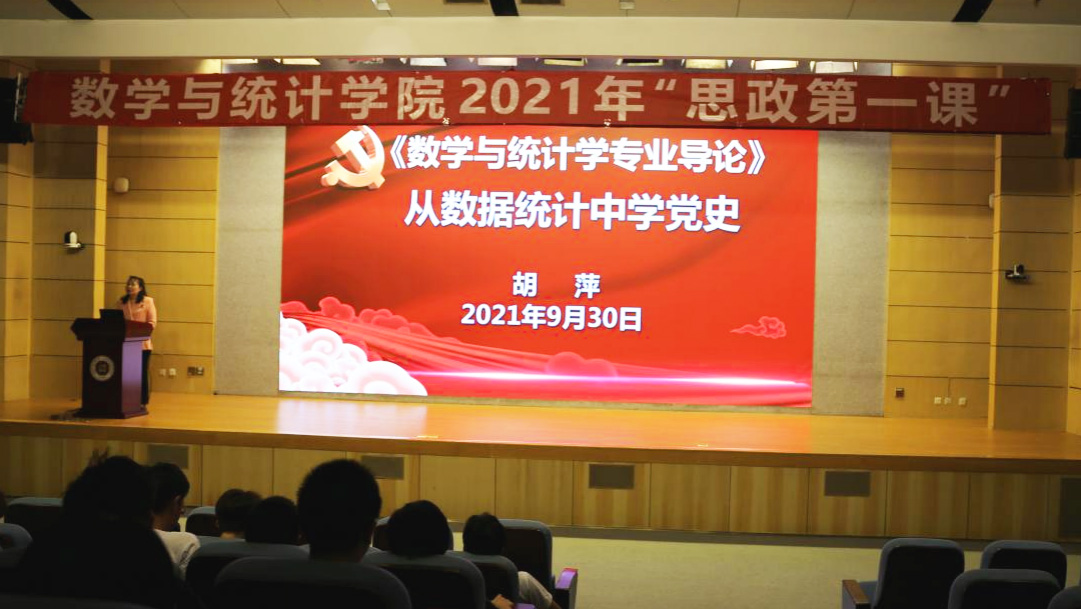2021年9月30日晚7:00,我院党委书记胡萍以《从数据中学党史》为题,在汇星楼一号报告厅为2021级全院大一学生带来数学与统计学院专业导论第二讲——思政第一课,旨在让同学们从中国的各项发展数据中了解到中国及中国共产党的发展和壮大。