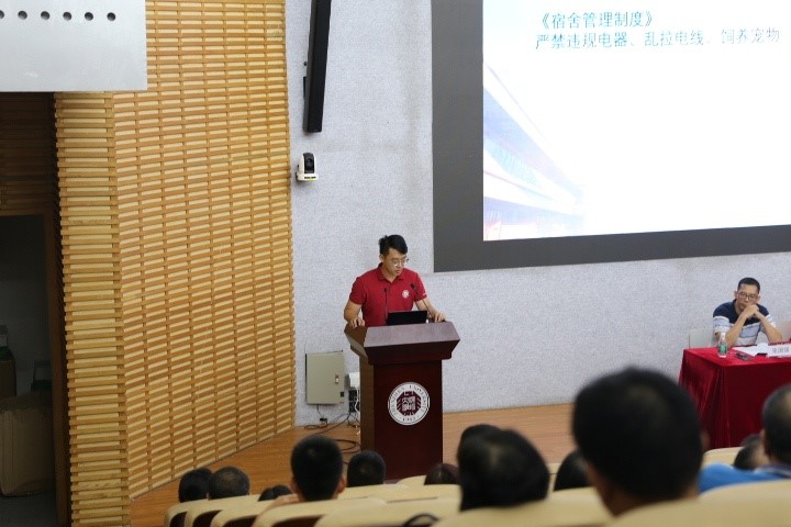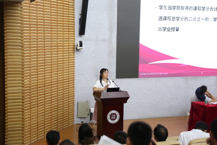 再然后是韩芳丹老师讲解学院学风建设相关制度,期中考试,学分讲座,家长联系,请假制度,评优评奖制度等。最后还进行了学工办的任务介绍和征兵政策的介绍。