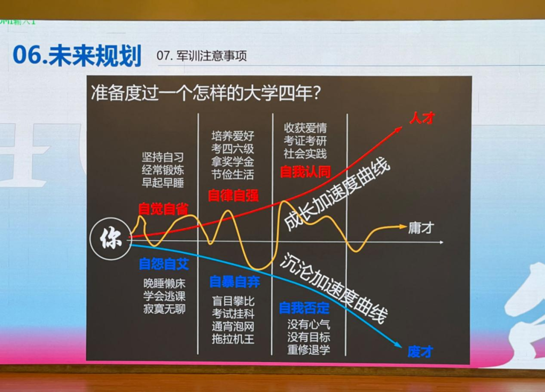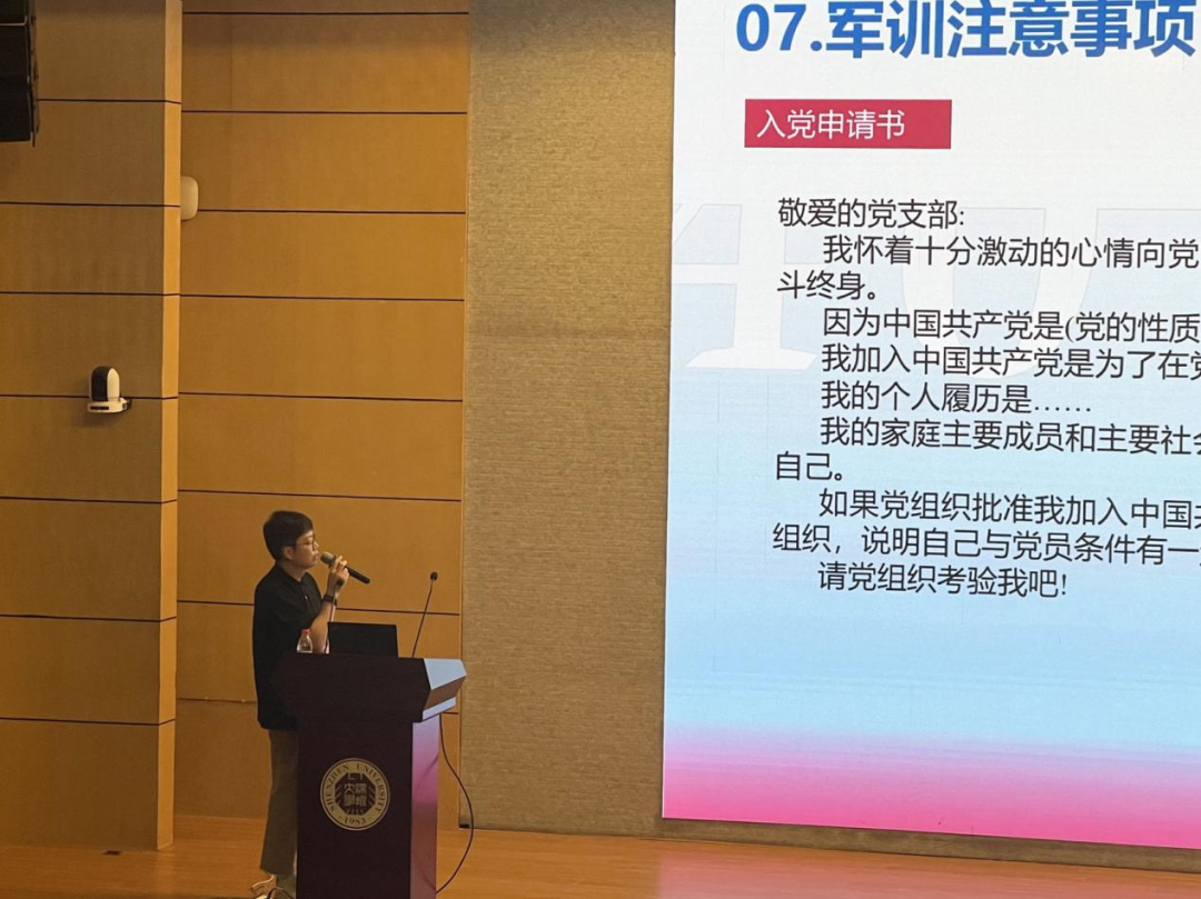 讲座最后,孙老师提醒了同学们军训时需要注意的事项,包括军训作息时间表、新生开学典礼、撰写入党申请书等事项。对新生接下来的军训生活,孙老师进行了更进一步的信息传达,让同学们对军训不再是因未知而恐惧,而是因知晓而努力适应,为新生们增添了动力与信心。