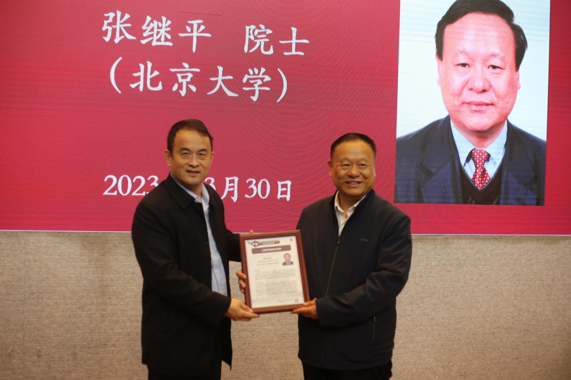 数学与统计学院院长主持。开讲前,周辉副校长为张继平院士颁授此次讲座纪念牌。