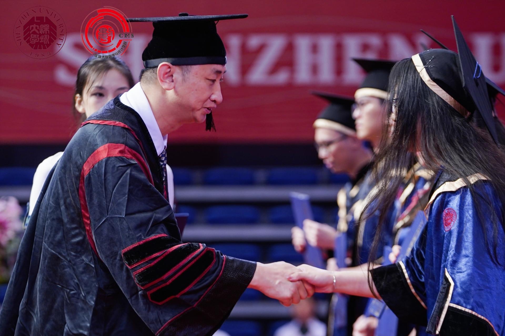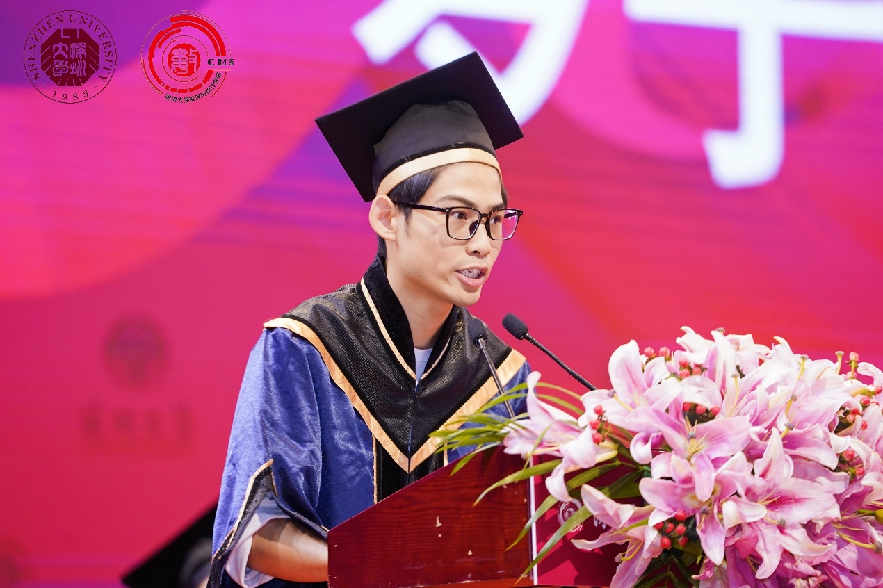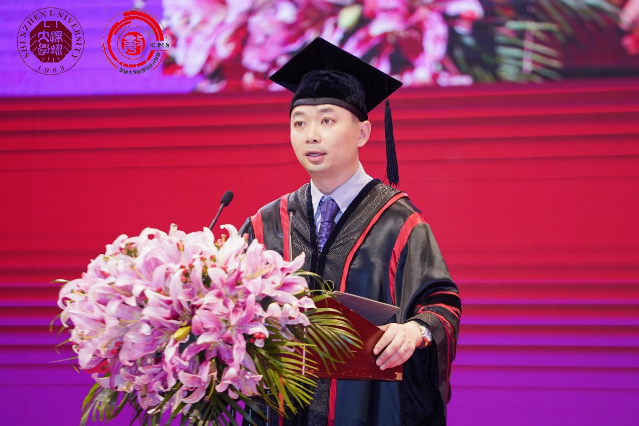 校友代表96级数学教育专业陈海平校友向毕业生们分享了自己的校园故事。他提到,虽然离开深大校园20余年,但荔园情深,时常忆起校园学习生活的点滴场景。他向毕业生们表达了美好的祝福,希望同学们前途似锦,未来多彩绚烂、手摘星河,也愿大家在未来的人生中尽性、知命,心有所戒,行有所止,坚守底线不乱作为,豪迈有力、奋发有为,教日月换新天。