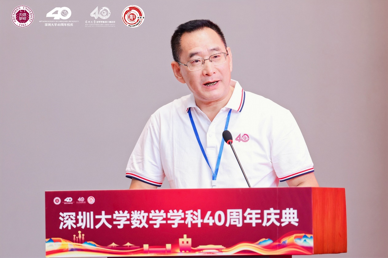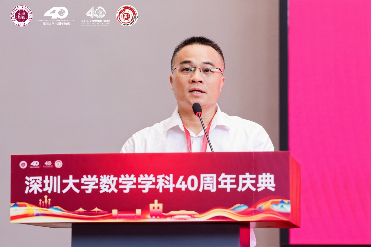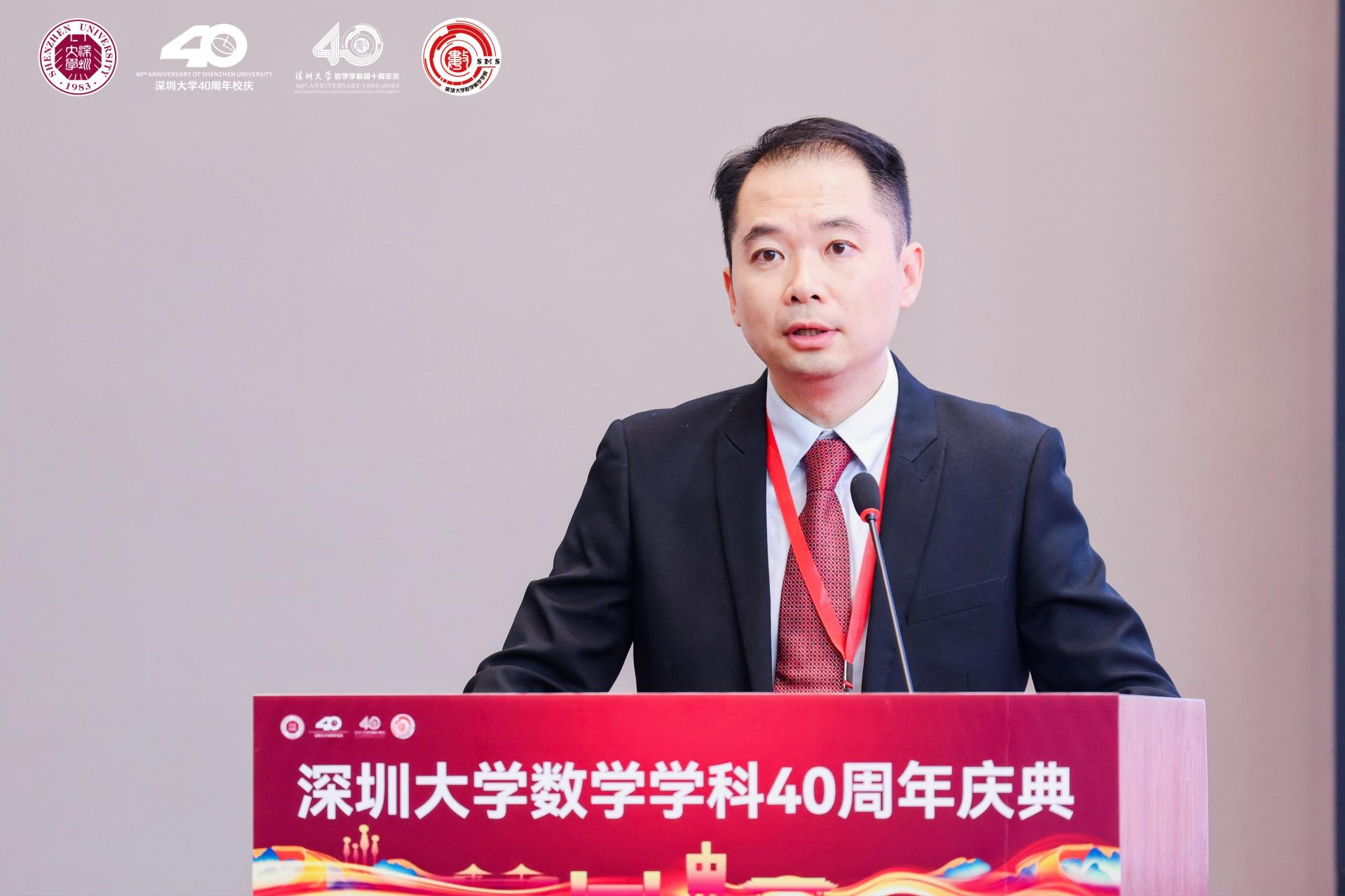 姚正安教授代表广东省数学会发表致辞,他表示,广东省数学会见证了深大数学从上世纪80年代的草创到如今的蒸蒸日上,希望以后能继续团结努力,持续推进深大数学奋勇前行,共同谱写广东数学乃至中国数学的新篇章。
