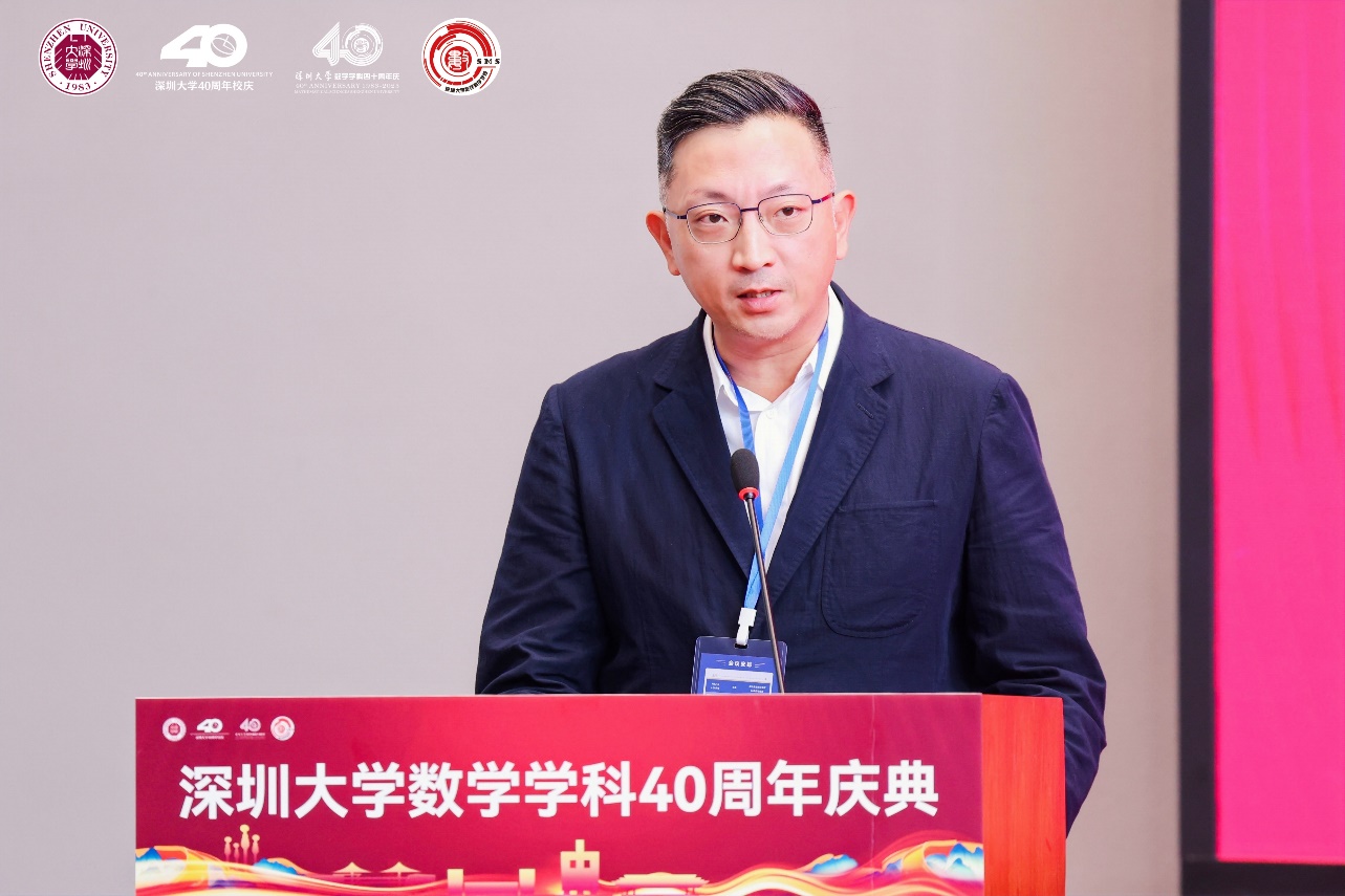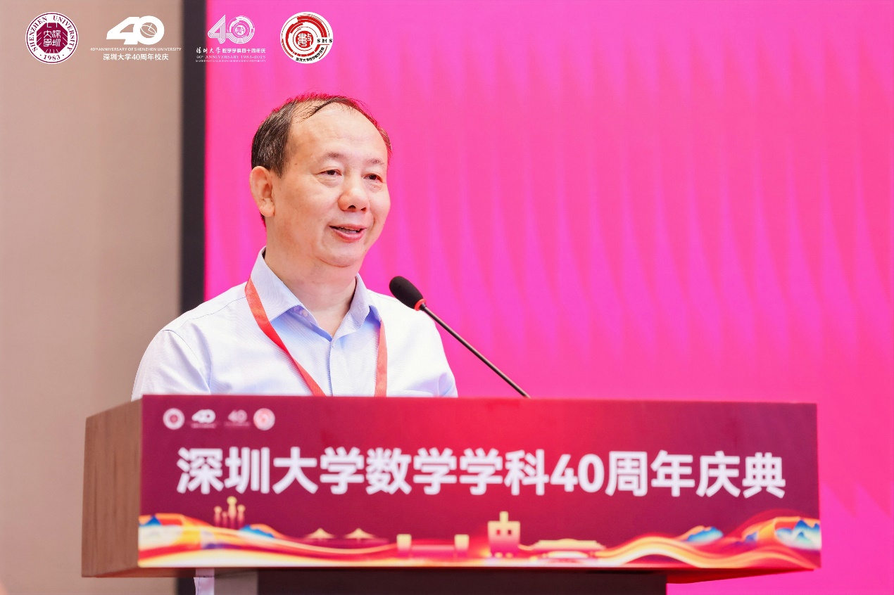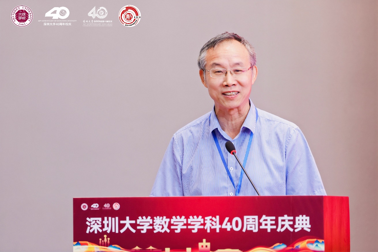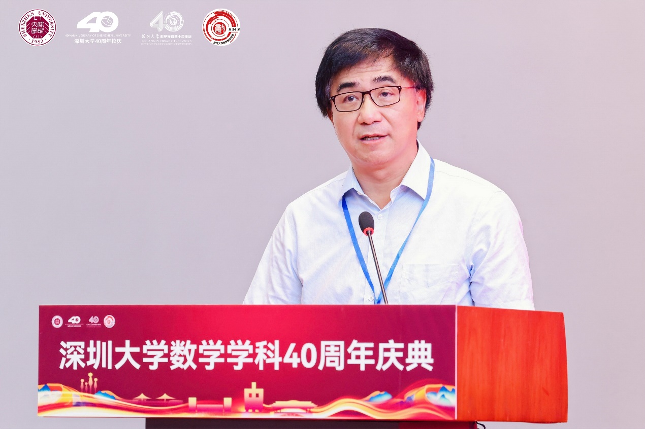 姚正安教授代表广东省数学会发表致辞,他表示,广东省数学会见证了深大数学从上世纪80年代的草创到如今的蒸蒸日上,希望以后能继续团结努力,持续推进深大数学奋勇前行,共同谱写广东数学乃至中国数学的新篇章。