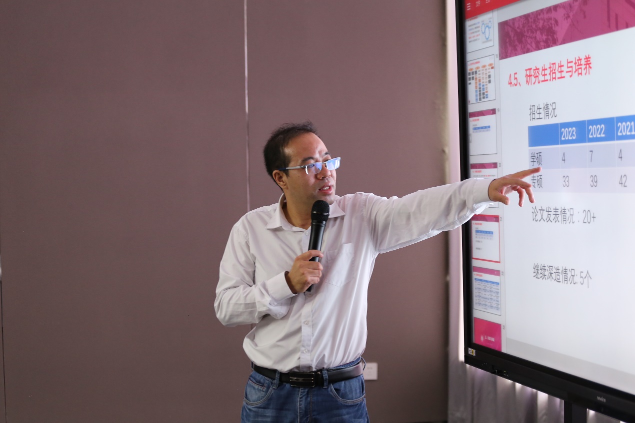 接着统计系主任周彦副教授就统计学科的发展现状进行了汇报,他从学科发展历程、师资概况、科研概况、学生培养概况以及问题和展望五个方面进行了介绍。他提到,我院统计学科目前存在高层次人才不足、师资结构教授比例过低、本科课程体系有待进一步优化等问题,未来将着力积极引进高层次人才、壮大青年教师队伍,并积极参与申报国家面上项目、申报统计学博士点以及进行本科教学课程体系改革。