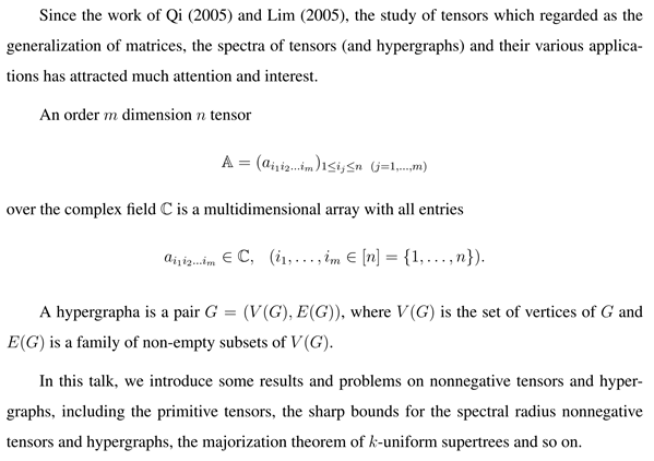 报告题目: Some results and problems on nonnegative tensors and hypergraphs