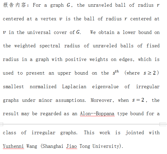 报告人简历:张晓东,上海交通大学教授、博士生导师。1998年6月在中国科学技术大学获得理学博士学位。曾在以色列理工学院(得到Lady Davis Postdoctoral fellowship资助)和智利大学做博士后、美国加州大学圣地亚哥分校等校做访问字着。多次主持国家自然科学基金项目和参加国家973项目、863项目,曾获安徽省科技进步二等奖和教育部科学技术进步三等奖。发表高水平论文230多篇,出版专著一本;曾在华人数学家大会上作邀请报告;担任CSIAM图论组合及应用专业委员会常务委员,曾任中国运筹学会图论组合分会副理事长。目前主要研究领域为谱图理论,随机图与复杂网络,组合矩阵论等。