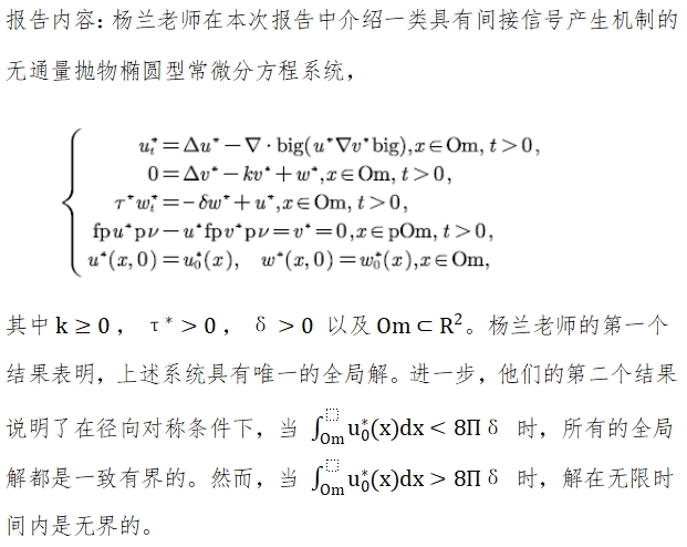 报告人简介:杨兰,博士毕业于电子科技大学。主要从事偏微分方程与常微分方程研究,先后在Nonlinear Anal.,Journal of Mathematical Analysis and Applications,Mathematical Methods in the Applied Sciences等国内外数学期刊上发表多篇论文。
