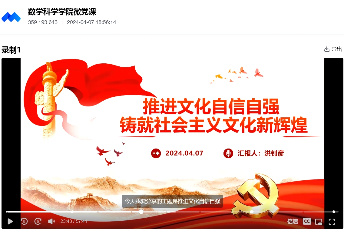 党员洪钊彦以“推进文化自信自强 铸就社会主义文化新辉煌”为主题进行了分享。洪钊彦讲到,树立文化自信是中华民族伟大复兴的必然要求,全国人民文化自信的增强,全社会凝聚力和向心力的极大提升,为新时代开创党和国家事业新局面提供了坚强思想保证和强大精神力量。洪钊彦还播放了“展望新阶段新征程”的视频,通过富有感染力的形式,极大增强了同学们的文化自信,激发了同学们推进文化自立自强,铸就社会主义文化新辉煌,建设社会主义文化强国的使命感和责任感,进而也坚定了同学们的道路自信、理论自信和制度自信。